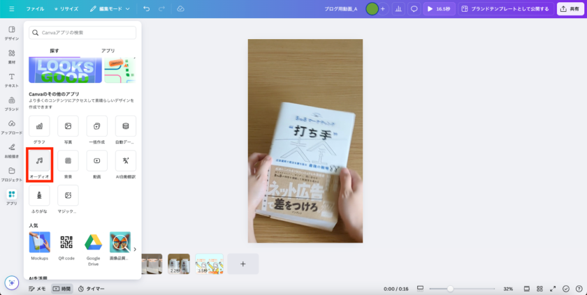 1、Canvaを開き、サイドパネルから「アプリ」を選択