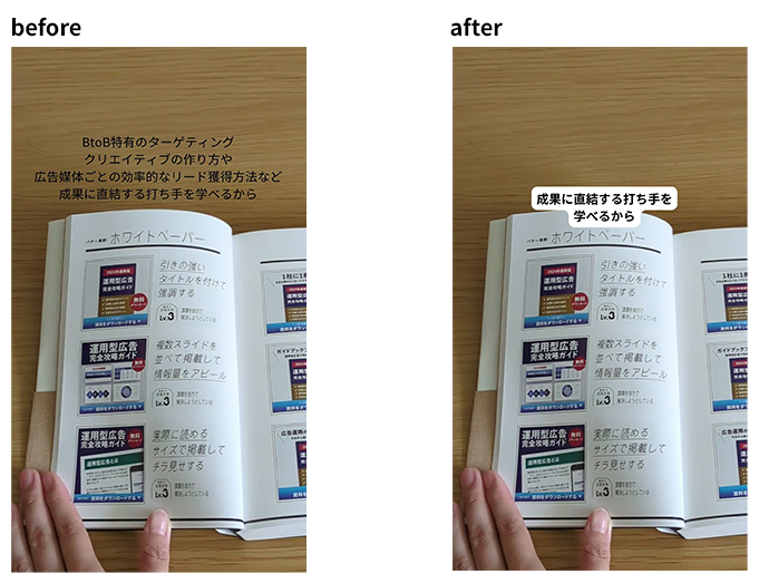 Beforeのように冒頭3秒にほとんど変化がない動画より、Afterのように背景素材やテキストに動きがある方がインパクトが強まり、ユーザーの興味を引きやすくなります。このように、冒頭からユーザーがつい見たくなる仕掛けを編集で取り入れることで、視聴を続けてもらえる動画に仕上げることができます。