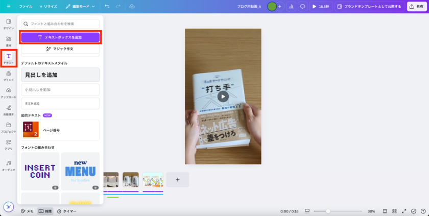 1、「テキスト」から「テキストボックスを追加」をクリック