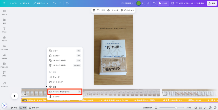 4、2と同様に、オーディオにマウスを合わせて、右クリックをして「オーディオを分割する」を選択