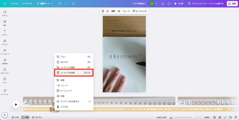 5、間の部分で右クリックし「1トラックを削除」あるいはdeleteキーで消す