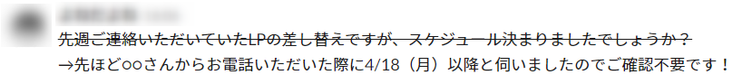 メールと違って後から文章を修正できるチャットツールもあります。送信後に修正する場合は、下記の例のように打ち消し線を使って修正内容が相手にも分かるようにしましょう。