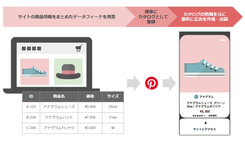 Pinterest ショッピングアドは、カタログと呼ばれるデータフィードを登録し、そのカタログ情報をもとに広告を動的に生成し、ユーザーの興味がありそうな商品を提案することができる広告フォーマットです。