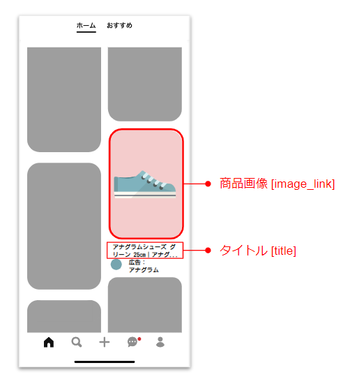 タイムライン上に表示されるPinterestショッピングアドのタイムラインには、カタログに登録した「image_link」と「title」の2つのフィールドからクリエイティブが作成されます。