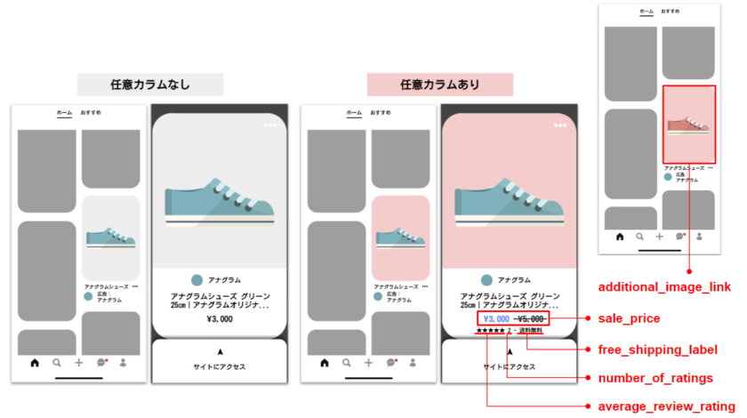 これらは、ユーザーの目にとまりやすいクリエイティブの情報をリッチにできる任意フィールドです。オンラインショッピングにおいて購入意欲を高める要素として重要なフィールドなので、優先的に設定することをおすすめします。