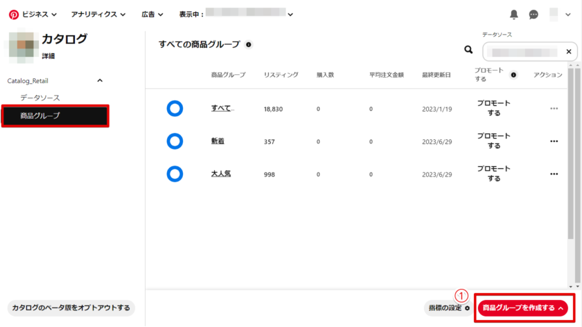 1.カタログの「商品グループ」から、「商品グループを作成する」をクリック