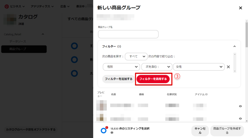 たとえば、アパレルECの女性向けの商品で女性への配信を強化したい場合は、フィルターから配信したい商品項目を選択します。