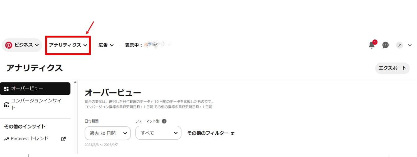 Pinterest アナリティクスは、広告管理画面左上の「アナリティクス」から確認ができます。