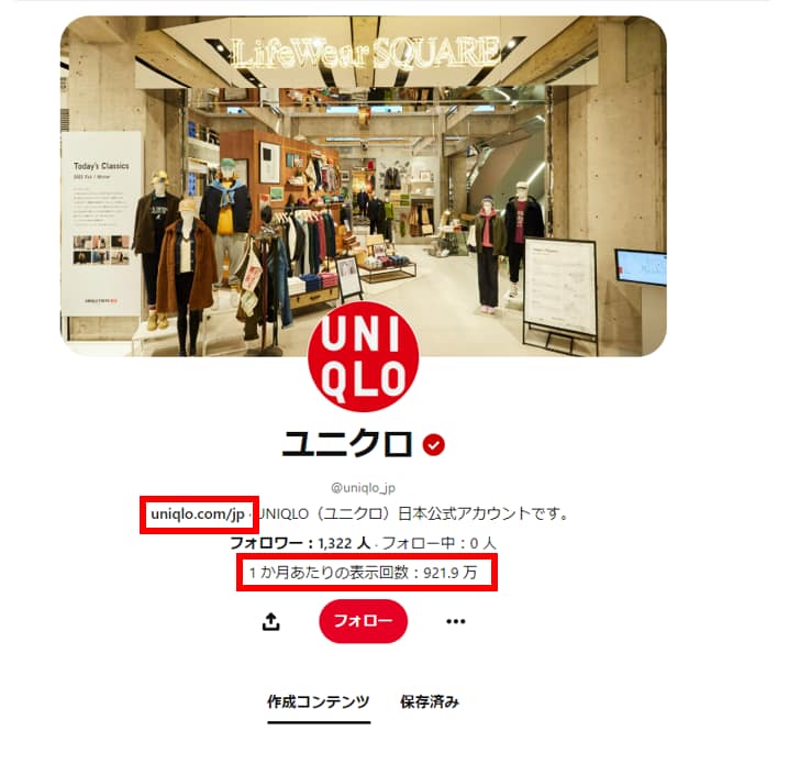 ビジネスアカウントにすることで、自身の運営するWebサイトのドメイン認証を行うことができます。サイトのドメイン認証をすると、プロフィールカバーの左側にURLが表示されます。加えて、1か月あたりの表示回数がフォローボタンの上部に掲載されることでプロフィールカバーをリッチにすることが出来ます。