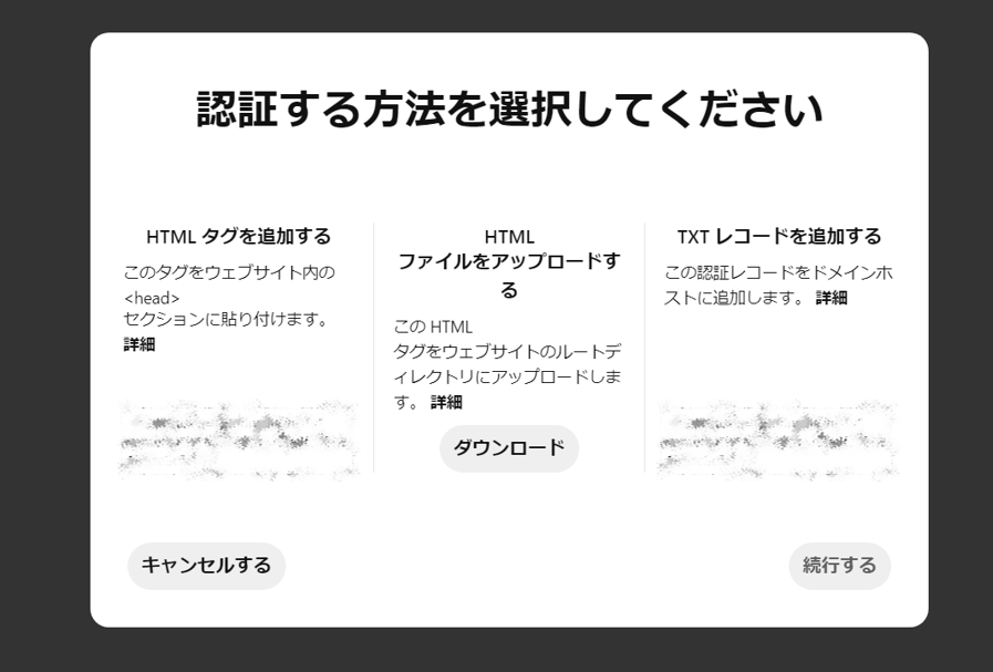 各方法の詳細の手順は、サイトのドメイン所有権を認証するを参照ください。