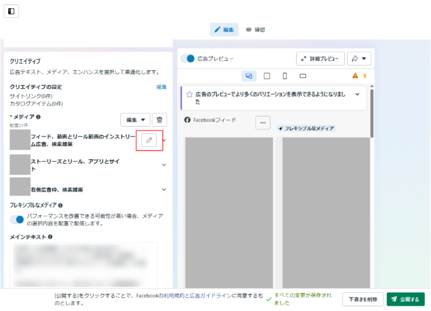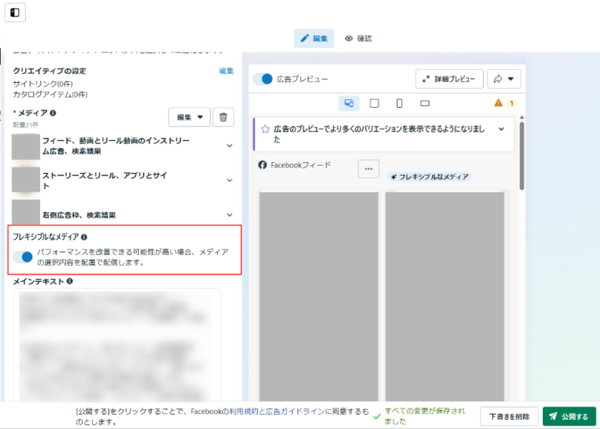 3.クリエイティブ設定箇所の真下に表示される「フレキシブルなメディア」ボタンで、ON・OFFの状況を確認できる。