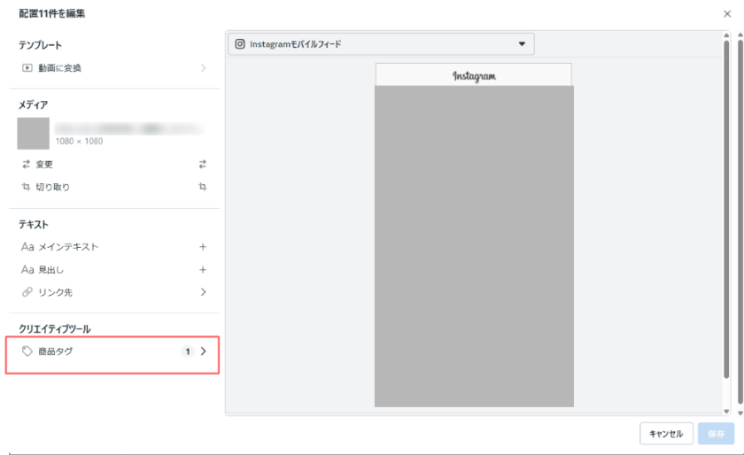 Metaビジネスマネージャの広告設定画面に入り、クリエイティブ設定後に商品タグの設定について確認できます。