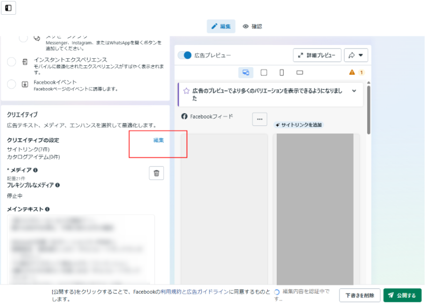 Metaビジネスマネージャの広告設定画面に入り、サイトリンクと同様に「クリエイティブの設定」から確認が可能です。