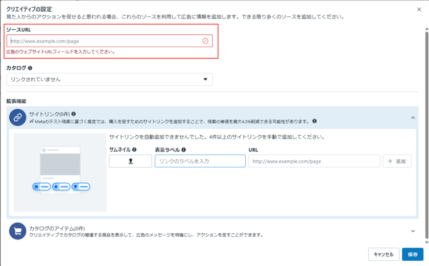 2.クリエイティブの設定から、ソースURLを指定することが可能です。
