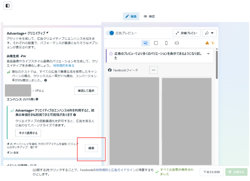 Metaビジネスマネージャの広告設定画面に入り、Advantage+ クリエイティブの枠内にある「エンハンス」から確認が可能です。