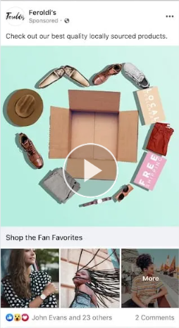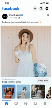 広告のクリエイティブに加えて、カタログ内の画像や価格などの商品情報が下部に表示され、ユーザーがより多くの商品を一覧で見られるようになります。見た目や機能は「コレクション広告」とほぼ同じで、複数の商品を一度に訴求できることで広告パフォーマンスの向上を狙う設計です。