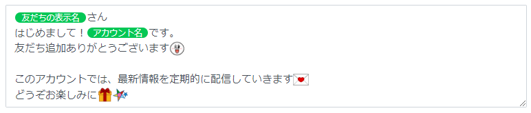 また、LINEのテキストメッセージでは、ユーザーのアカウント名(友だちの表示名)と自社のアカウント名(アカウント名)を自動で挿入できます。