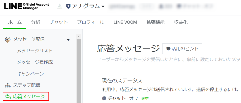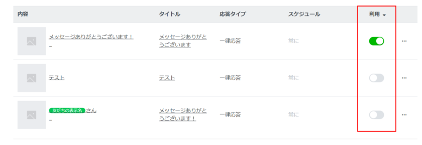 作成した応答メッセージのオンオフは、利用設定より簡単に切り替え可能です。