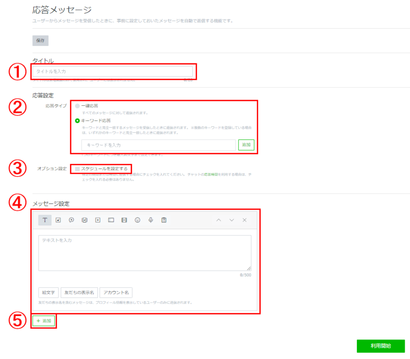特定の期間や時間のみ応答メッセージを利用したい場合はオンにします。