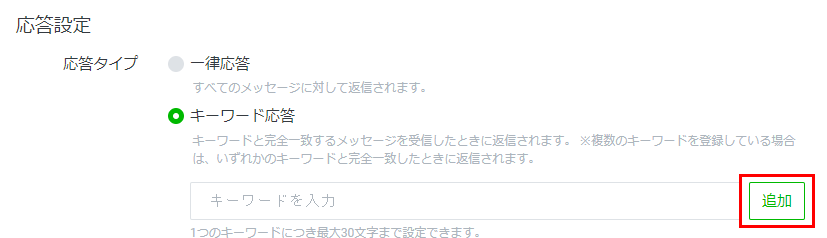 キーワード応答の場合は、応答の条件となるキーワードも設定します。キーワードの上限文字数は30文字で、1つの応答メッセージで設定できるキーワード数は最大51個です。