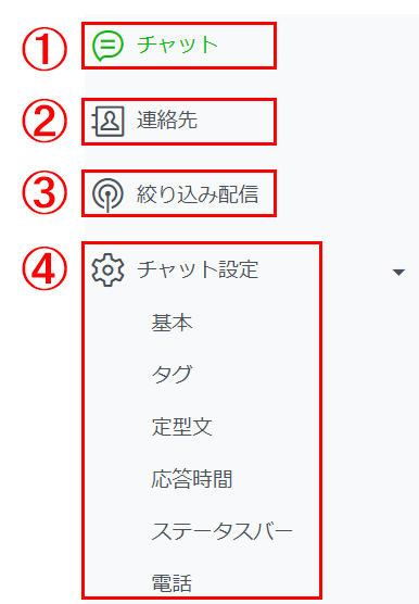 | ④チャット設定 | 送信方法や定型文、応答時間などのチャットに関する設定を行う | ※チャットの設定方法については、詳しくはこちらを参考にしてください |