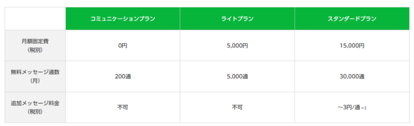 メッセージ通数は月額プランによって異なりますので、下記の表をご確認ください。