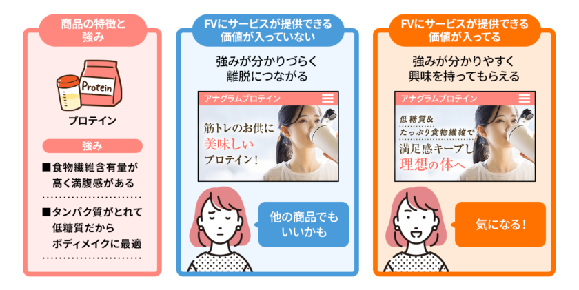 ここでしっかりと、サービスが提供できる価値を伝えることで、ユーザーがサービスの価値を誤って認識してしてしまうことを防げます。誤った認識のまま申し込みになると、早期に解約になったり、返品やクレームにつながったりすることも考えられるのでしっかりと自社が提供できる価値を伝えておきたいですね。