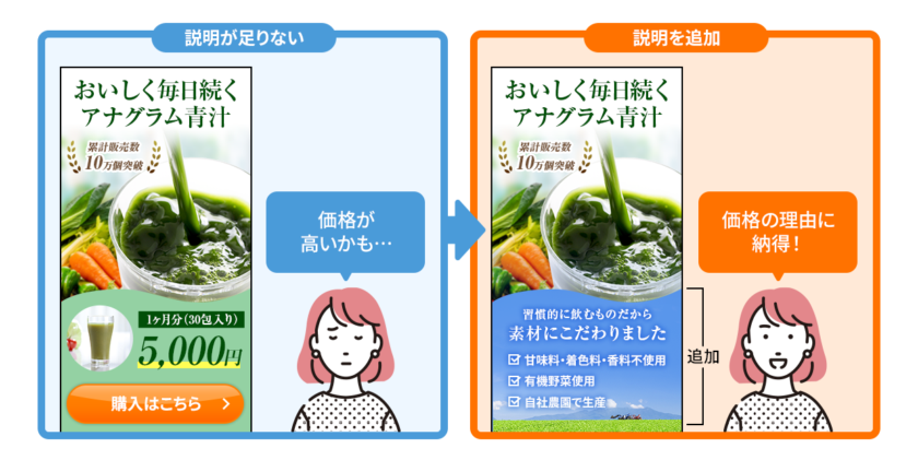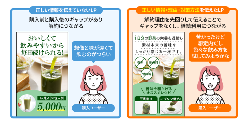 例えば、健康食品で商品の特性として「苦味が強い」ものがあるとします。この商品特性を伝えないと、「味が苦い」という理由で解約に繋がるかもしれません。この場合、「苦みが強いです」とだけ伝えるのではなく、「栄養が豊富だから苦味が強い」と、なぜ苦いのかを説明することで、ユーザーが納得感をもつことができます。