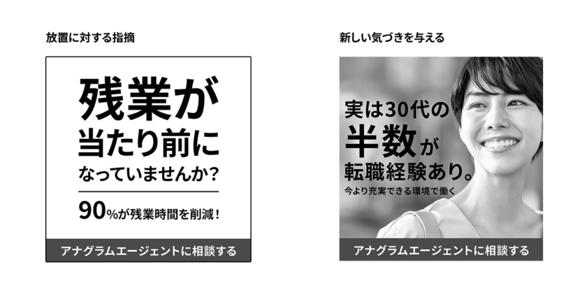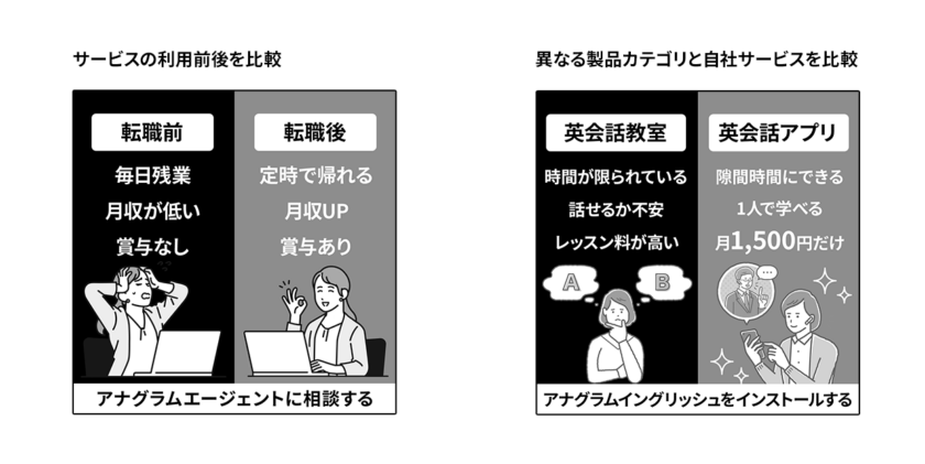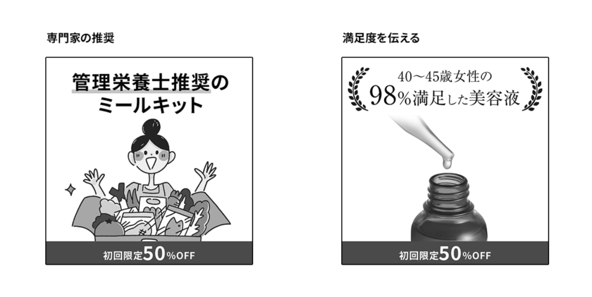 潜在層向けの場合は、左のサンプルバナーのようにサービスの利用前後でどれだけ状況が変わるかを比較するのがおすすめです。自社サービスとは別の解決手段を想起しているユーザーには、右のように「こんな解決手段もありますよ」と提示しつつ、強みとなる部分を強調します。
