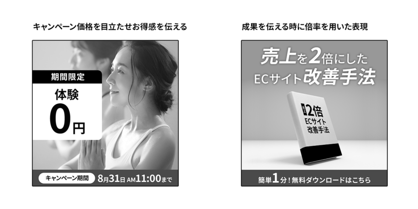 「〇〇な人必見」という風に、年齢、性別、職業、趣味などでターゲットを絞り込んで呼びかけると、該当者が「自分に関係のある広告だ」とひと目でわかるため、注目してもらいやすくなります。