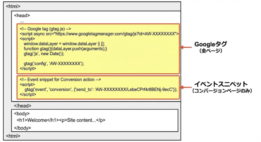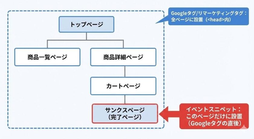 イベントスニペットは、このGoogleタグの後に配置します。設置場所を誤るとコンバージョンが正確に計測されないため、作業完了後は必ず確認を⾏いましょう。