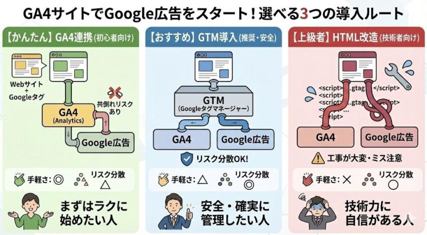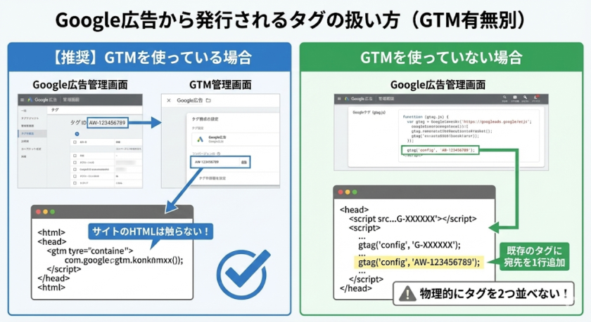 重要なポイント: Googleタグを全ページに設置するだけで、基本的なリマーケティング⽤のデータ収集も同時に⾏われます。つまり、Googleタグ1つで「訪問者データの収集」と「広告クリック情報の記録」の両⽅がカバーされる仕組みです。