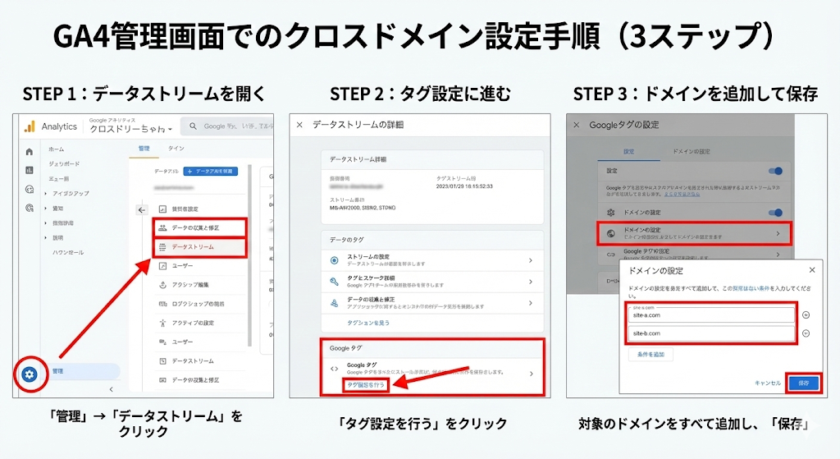 なお、サブドメイン(例:shop.example.com と www.example.com)の場合は、同じGoogleタグを設置していればクロスドメイン設定は不要です。同⼀ドメイン配下のため、Cookieが共有されるからです。