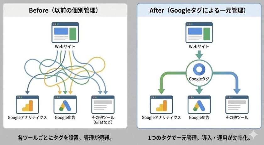 かつてはGoogle広告とGoogleアナリティクス、それぞれに個別のタグを設置する必要がありました。しかし2022 年以降、Googleは「グローバルサイトタグ(gtag.js)」を「Googleタグ」へと進化させ、複数のGoogle製品を1 つのタグで管理できる仕組みを整えています。