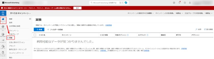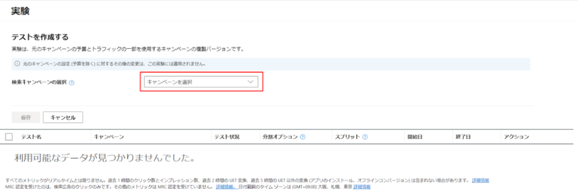設定が完了したら、Microsoft広告のABテスト機能を活用して検証を行います。