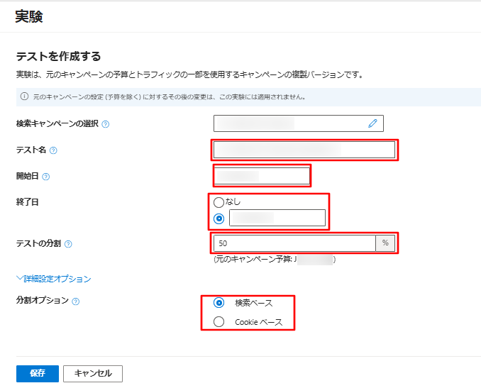 - テストの分割:元のキャンペーンとテストを行うキャンペーンの配信割合を任意の数字で設定できます