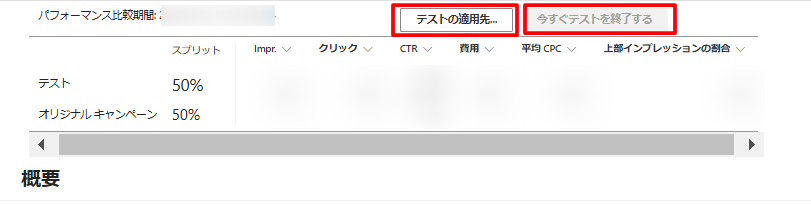 ⑥テスト期間が終了したら、テスト内容を既存のキャンペーンにて適用するか、停止するかを選択しましょう。適用する場合は、「テストの適用先...」を選択します。テストを途中で中断する場合は、「今すぐテストを終了する」を選択しましょう。