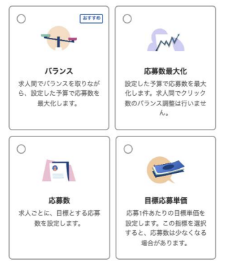 応募数最大化は、大量採用が必要な求人、求人件数が少ないキャンペーン、 一部の求人に予算と応募が偏っても問題がない場合に最適の目標です。