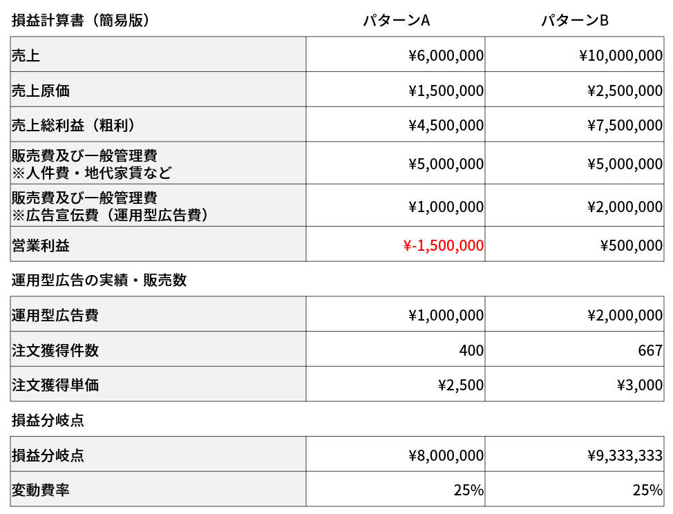 この場合、運用型広告単体で見れば注文獲得単価が2,500円のパターンAのほうが利益率は高そうに見えますよね。ところが売上原価や販管費を加味するとパターンAは1,500,000円の赤字です。対してパターンBは注文獲得単価は高いですが、販売数を伸ばし損益分岐点の9,333,333円を超える売上のため500,000円の利益が出ています。このように、必ずしも運用型広告単体で見た費用対効果が高いからといって成果が良いと言えるわけではなく、実際は損益分岐点を超えるまで売上を伸ばさないとそもそも利益が出ない可能性もあるということです。中小企業に多いですが、広告経由の売上がないと損益分岐点を超える売上が立たない広告主は特に、シミュレーションするうえで損益分岐点の視点は忘れずに盛り込みましょう。