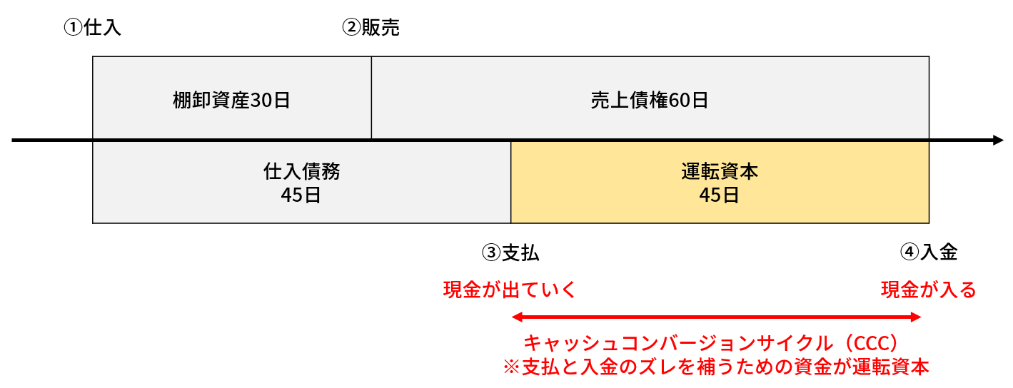 上の図のように、企業は原材料や商品を仕入れるために現金を支払い、商品やサービスを販売して最終的に現金が入ってくるまでに、キャッシュコンバージョンサイクル(Cash Conversion Cycle|通称:CCC)と呼ばれる運転資本が必要な期間が発生します。