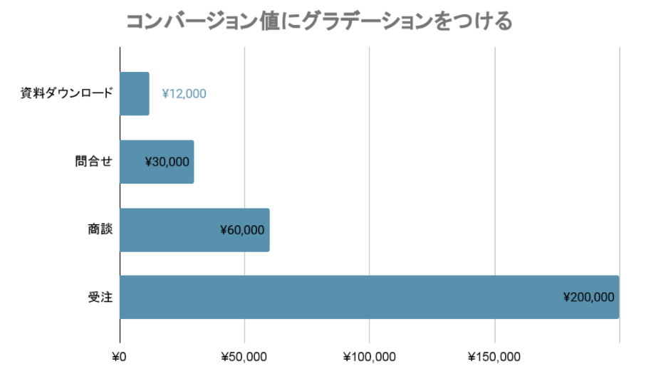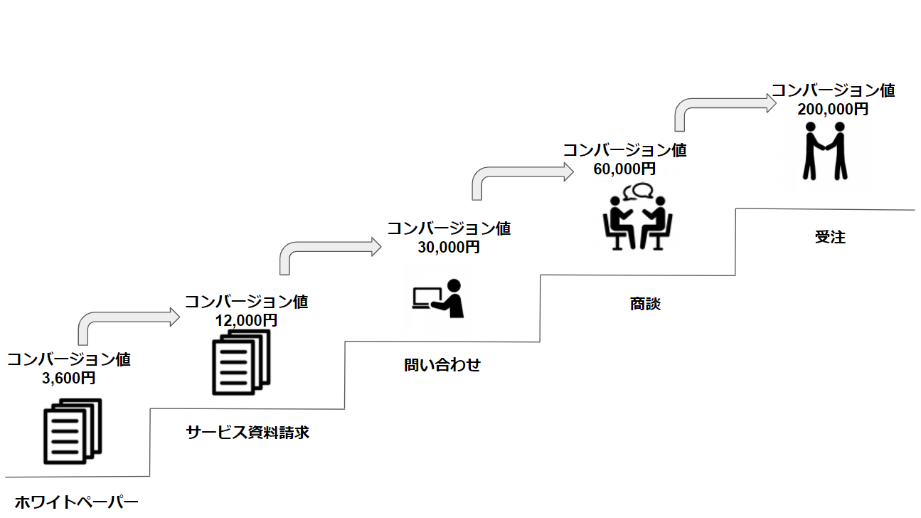 資料請求15,000円という価値をベースにホワイトペーパーや問い合わせのコンバージョン値にグラデーションをつけていきます。