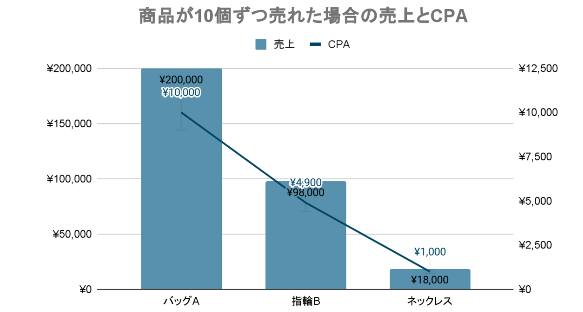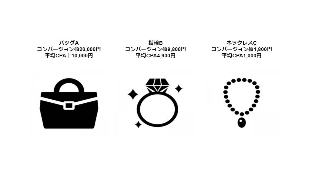 上記の図で考えるのであれば、CPAが安く獲得できるネックレスCのコンバージョン件数が増えてしまいます。安いCPAで獲得は出来ますが、コンバージョン値が低いため、売上が伸びづらくなります。