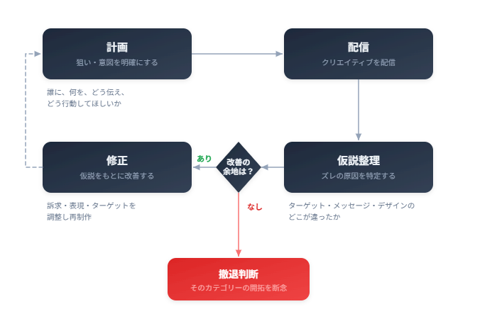 撤退の線引きは簡単ではありません。ただ、クリエイティブやメッセージの改善幅とその期待値が小さくなってきた時が判断のポイントになるでしょう。逆に言えば、試したい表現や訴求が残っていれば、最終判断にはまだ早い。今回の案件では、予算や状況と相談しながらも、「もうダメだ」となるまで検証を続けました。