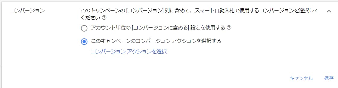 最後に「このキャンペーンのコンバージョンアクションを選択する」にチェックを入れ、「コンバージョンアクションを選択」をクリックして、最適化の対象としたいコンバージョンをすべて選択します。