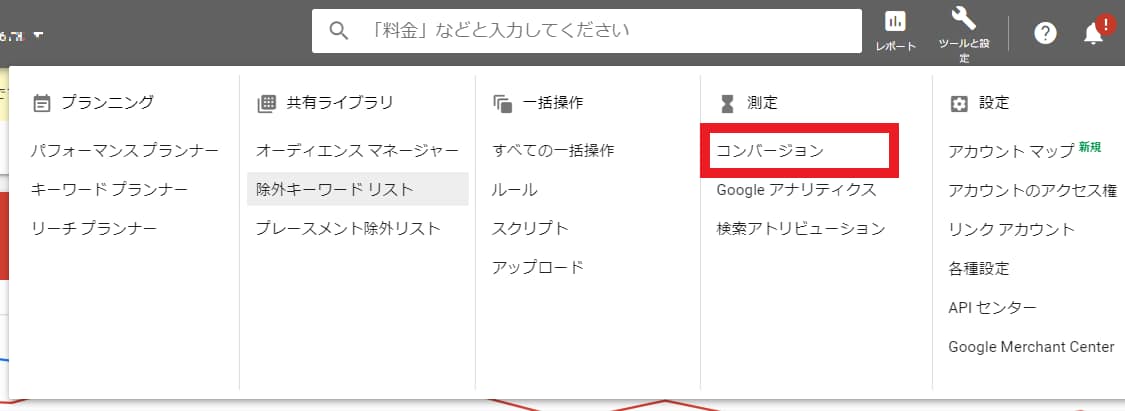 まず、管理画面の右上「ツールと設定」より、「測定」欄にある「コンバージョン」を選択します。