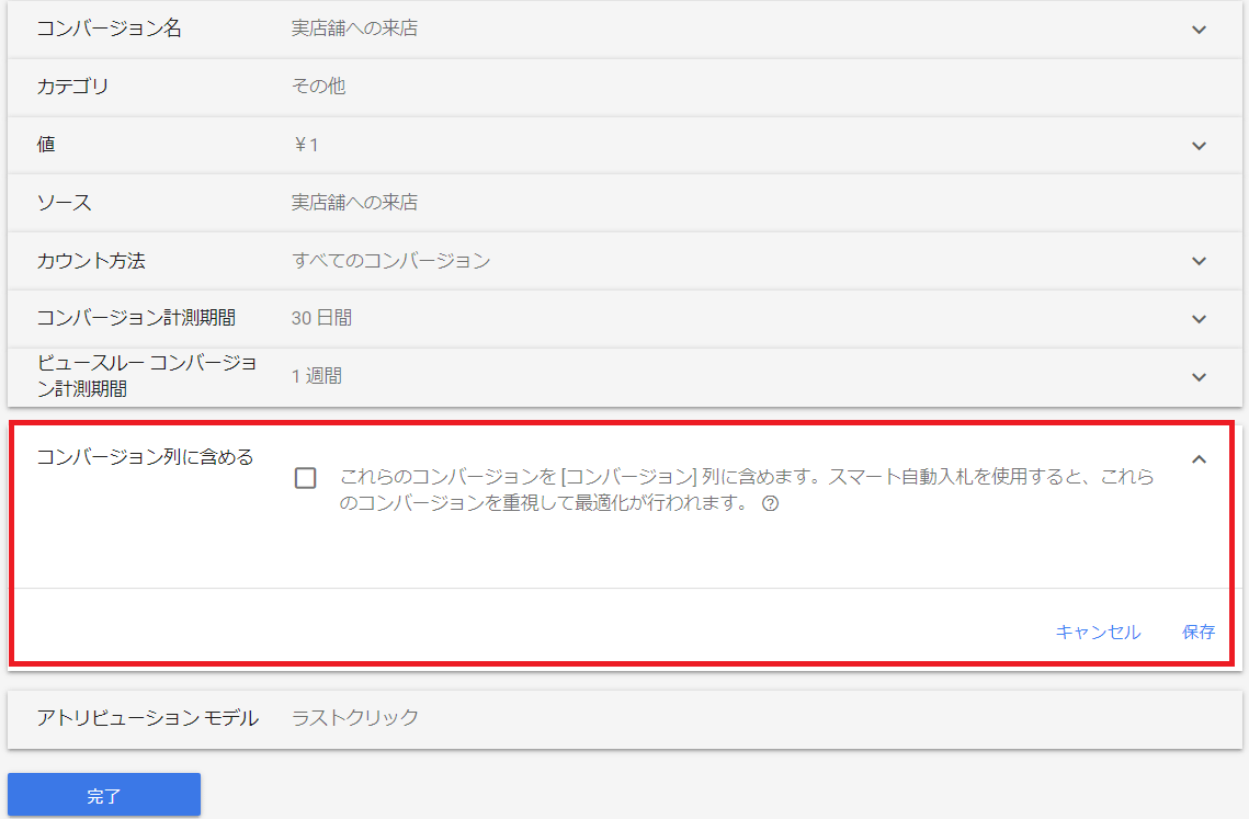 最後に「コンバージョン列に含める」のドロップダウンを開き、チェックボックスにチェックをいれます。