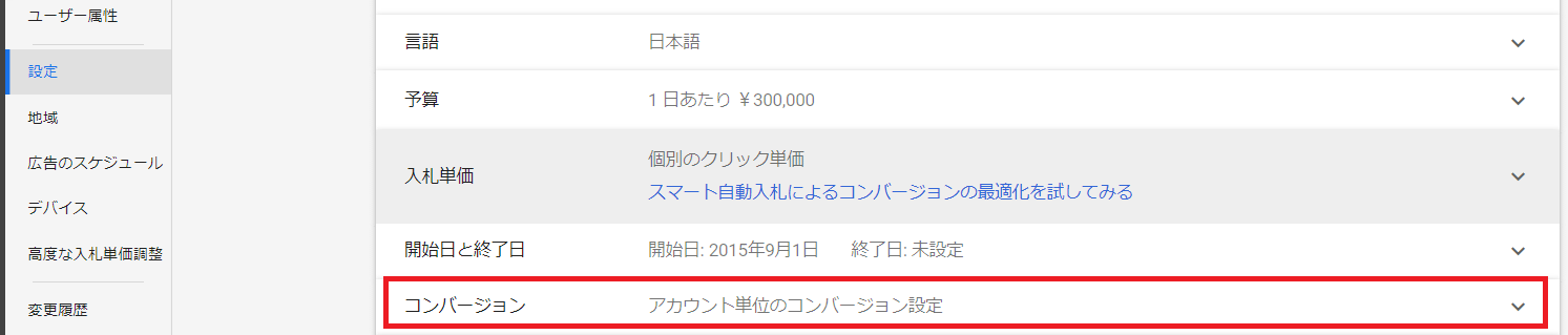 次に、「コンバージョン」のドロップダウンをクリックします。