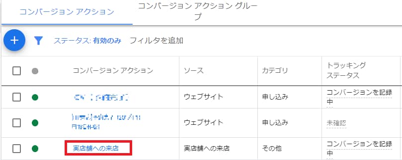 次に「コンバージョンアクション」タブより、「実店舗への来店」がソースのコンバージョンアクションを選択し、編集します。
