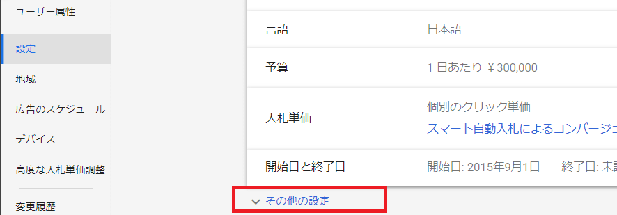 まず、キャンペーンの「設定」より、「その他の設定」を選択します。
