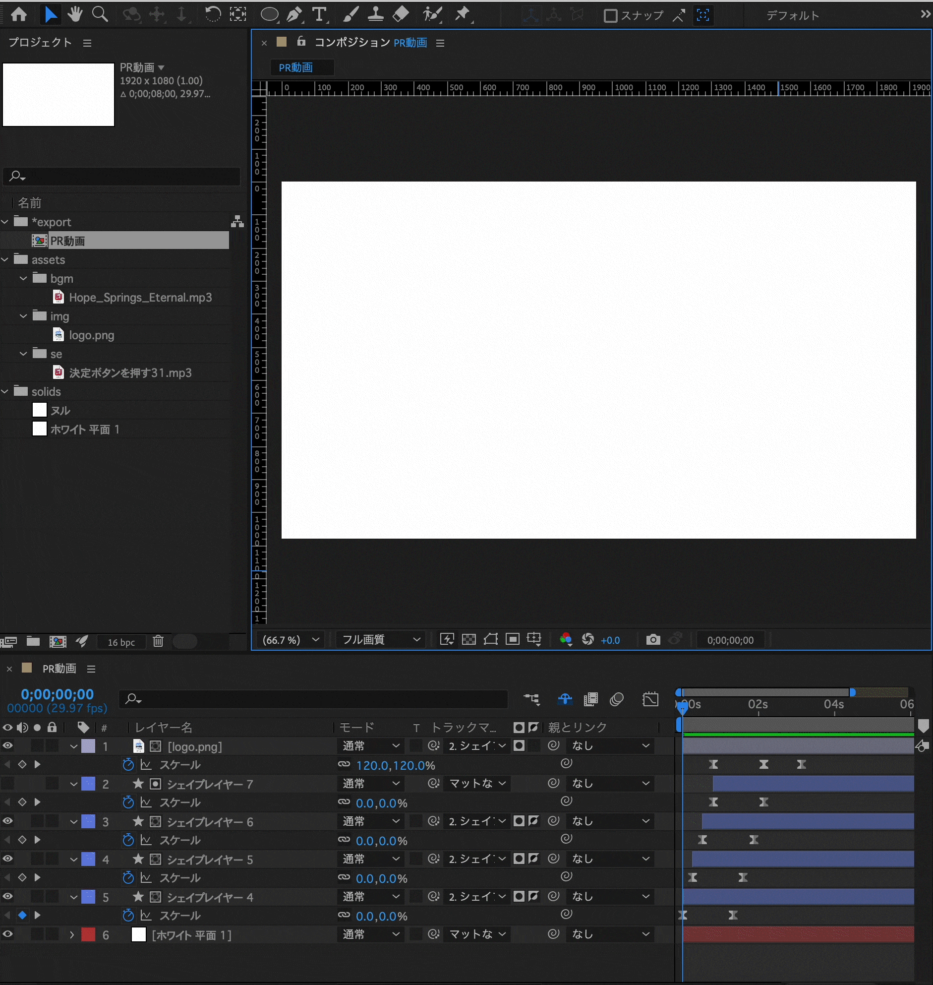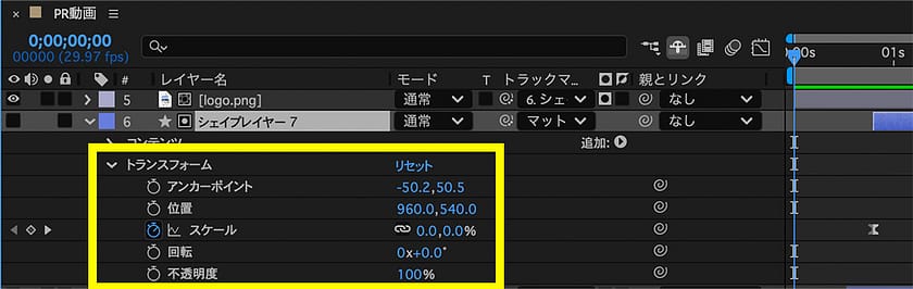 ロゴを表示する動きは、スケールにアニメーションを追加するだけで表現ができます。